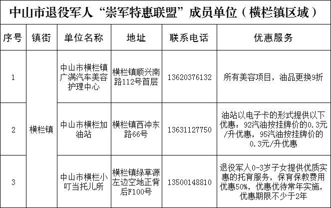 為貫徹落實(shí)習(xí)近平總書(shū)記關(guān)于退役軍人工作重要論述精神,加強(qiáng)退役軍人保障工作,我市決定組建中山市“崇軍特惠聯(lián)盟”。橫欄鎮(zhèn)迅速行動(dòng),以“讓退役軍人得實(shí)惠,讓軍人職業(yè)受尊崇”為宗旨,秉持“自愿參與、志愿服務(wù)、優(yōu)質(zhì)規(guī)范、合作共贏”原則,分批次招募聯(lián)盟成員單位,為廣大退役軍人提供價(jià)格優(yōu)惠產(chǎn)品、優(yōu)先優(yōu)待服務(wù)。12月2日,橫欄鎮(zhèn)首批3家“中山市退役軍人崇軍特惠聯(lián)盟”商家正式掛牌。 橫欄鎮(zhèn)副鎮(zhèn)長(zhǎng)程輝、鎮(zhèn)公共服務(wù)辦和鎮(zhèn)退役軍人服務(wù)中心等負(fù)責(zé)人分別到橫欄鎮(zhèn)廣滿汽車美容護(hù)理中心、橫欄加油站、橫欄小叮當(dāng)托兒所進(jìn)行授牌。 據(jù)橫欄鎮(zhèn)退役軍人服務(wù)中心負(fù)責(zé)人介紹,凡持有退役證或優(yōu)待證等有效證件的退役軍人,可到目前市內(nèi)102個(gè)“崇軍特惠聯(lián)盟”成員單位享受優(yōu)惠商品和服務(wù)。同時(shí),橫欄鎮(zhèn)將繼續(xù)探索擁軍優(yōu)撫新模式,吸引更多的企業(yè)、商家加入“崇軍特惠聯(lián)盟”,為退役軍人提供更多更好的服務(wù),增強(qiáng)軍人榮譽(yù)感、自豪感,努力營(yíng)造崇軍的良好社會(huì)氛圍,切實(shí)為退役軍人辦實(shí)事、辦好事、解難事,致敬“最可愛(ài)的人”。