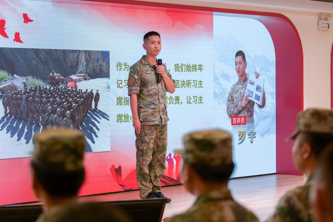 現(xiàn)場,新疆高原69316部隊邊防一營副政治教導員、優(yōu)秀共產(chǎn)黨員羅宇,中國人民解放軍91878部隊上尉干事郭開強,69316部隊邊防三營五連一班班長張長城3位部隊宣講員激情開講,分享感人的軍旅故事。  羅宇分享軍旅故事。記者 易承樂 攝