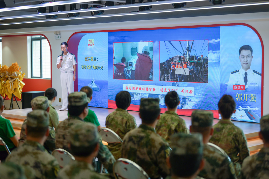 郭開強:勇闖大洋 為國爭光 2008年12月,應聯(lián)合國授權(quán)請求,奉中央軍委命令,南海艦隊武漢艦、海口艦、微山湖艦組成第1批護航編隊,拉開了人民海軍舉世矚目的亞丁灣、索馬里護航序幕,這是自600多年前鄭和下西洋以來,中國真正意義上的遠海非戰(zhàn)爭軍事行動,開啟了人民海軍從“黃水”駛向“藍水”的壯麗航程。 91878部隊郭開強干事為大家?guī)碇黝}宣講《勇闖大洋 為國爭光》。 郭開強介紹—— 迄今為止,人民海軍已累計派出44批100余艘次艦艇參加亞丁灣、索馬里海域護航,完成1500多批7000余艘中外船舶護航任務,解救、接護各類船舶近百艘,其中外國船舶超過50%。 護航官兵一次次直面生死、一次次化解危機、一次次挑戰(zhàn)極限,用忠誠與奉獻、責任與擔當,彰顯大國海軍形象,譜寫了人民海軍邁向世界一流海軍的新時代壯歌。 張長城分享軍旅故事。記者 易承樂 攝