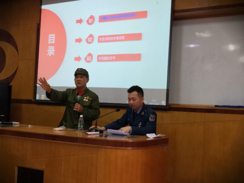 李金洪與陳偉樂(lè)兩代退役軍人同臺(tái)講述崢嶸歲月。 由于身體不適,李金洪無(wú)法長(zhǎng)時(shí)間親述那段崢嶸歲月,但是這位老兵又是那么熱心地想讓更多后輩知道祖國(guó)的不容易,人民當(dāng)今幸福生活的來(lái)之不易,毅然接受邀請(qǐng),克服身體不適,再次走上講臺(tái),結(jié)合親身經(jīng)歷給在場(chǎng)師生講述1979年那段崢嶸歲月。李金洪表示,軍人的使命是保衛(wèi)祖國(guó),抵抗侵略,“如果再給我選擇的機(jī)會(huì),我還是義無(wú)反顧上戰(zhàn)場(chǎng),我們有偉大的共產(chǎn)黨、有偉大的制度、有偉大的祖國(guó)和人民,我們應(yīng)該為自己是一名中國(guó)人和生活在祖國(guó)的大地上感到驕傲和自豪”。 此次宣講活動(dòng)中,李金洪多了一個(gè)戰(zhàn)友,他叫陳偉樂(lè),是駐香港部隊(duì)的退役軍人,也是神灣鎮(zhèn)退役軍人服務(wù)中心的工作人員,李金洪和陳偉樂(lè)雖然是不同時(shí)代的退役軍人,但是有著同一個(gè)方向,就是對(duì)黨、祖國(guó)和人民無(wú)限的愛。李金洪身體不適,陳偉樂(lè)就來(lái)充當(dāng)他的“傳聲筒”,將一段段難忘經(jīng)歷分享給廣大師生們。
