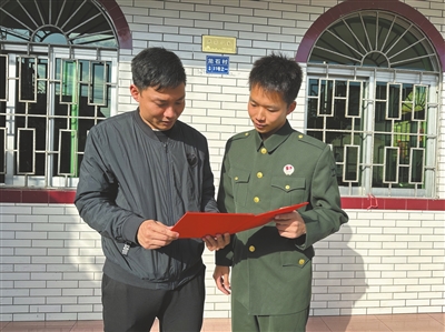 彭煒文(右)向五桂山街道武裝部工作人員展示自己的退役證書(shū)。