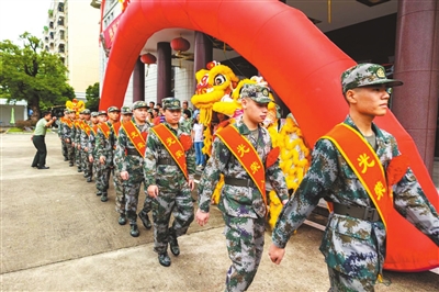 新兵們身穿戎裝、肩披紅綬帶,整齊列隊奔赴軍營。通訊員供圖