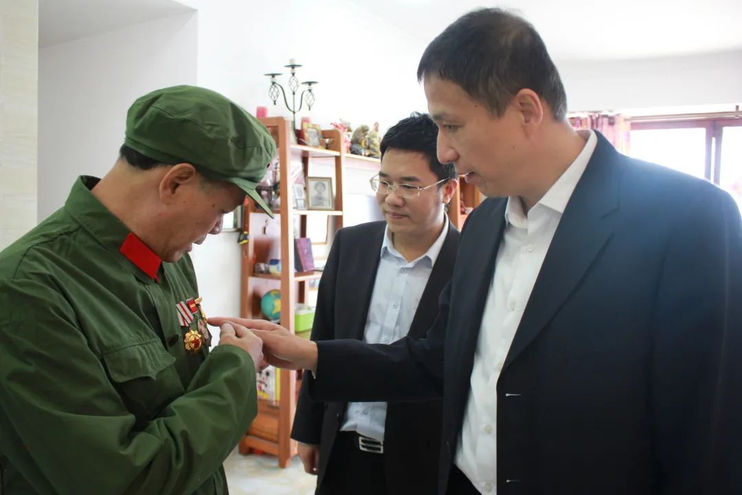 “身體現(xiàn)在怎么樣,有什么困難嗎?”走進徐綺基家中,周俊峰書記與他親切聊起家常,詳細了解其身體狀況和生活情況。基叔高興之余,穿起了軍裝,還戴上了勛章,向現(xiàn)場人員進行展示。