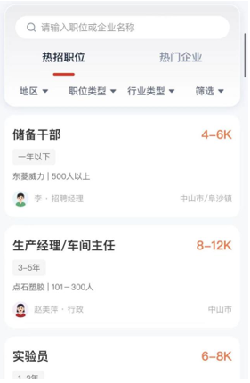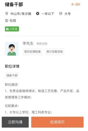 ▲求職者注冊流程 3、投遞簡歷 完善注冊信息后,即可跳轉(zhuǎn)至【2022年度珠中江區(qū)域退役軍人及隨軍家屬網(wǎng)絡(luò)招聘會】,點擊職位名稱可進入相應(yīng)職位詳情頁,點擊企業(yè)可進入企業(yè)詳情頁,可查看企業(yè)發(fā)布的在線職位。 點擊職位詳情頁左下方【立即溝通】可和HR進行溝通,點擊右下方【投遞簡歷】即可完成投遞。