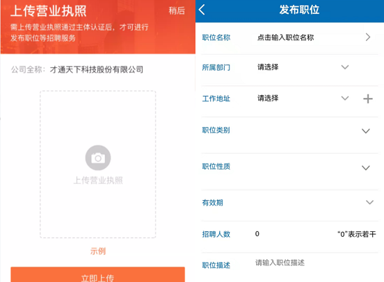 ▲企業(yè)注冊流程 2、發(fā)布職位 完善注冊信息后,即可進入到【企業(yè)會員中心管理后臺】,發(fā)布職位前【上傳營業(yè)執(zhí)照】,【通過審核后】即可發(fā)布職位,企業(yè)發(fā)布的符合條件的崗位將同步更新至【2022年度珠中江區(qū)域退役軍人及隨軍家屬網(wǎng)絡(luò)招聘會】
