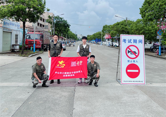 沙溪鎮(zhèn)退役軍人志愿者和民兵協(xié)助公安交警開展高考護(hù)航工作。 7日早上7時(shí)許,在沙溪鎮(zhèn)寶珠東路龍山中學(xué)路口,多名退役軍人紅旗志愿服務(wù)隊(duì)隊(duì)員和民兵協(xié)助公安交警在路口設(shè)立警戒線,做好交通疏導(dǎo)、公共秩序維護(hù)、卡點(diǎn)值守等服務(wù),同時(shí)為考生及家長(zhǎng)提供礦泉水、應(yīng)急救援等服務(wù),給考生營(yíng)造一個(gè)安全、寧?kù)o、有序、文明的考試環(huán)境。 在中山市桂山中學(xué)門口,三鄉(xiāng)鎮(zhèn)退役軍人志愿者和民兵按照事先分工安排,分散在各個(gè)交通路口,有的拉警戒線,有的指揮車輛通行,有的疏散人群,有的負(fù)責(zé)在助力點(diǎn)發(fā)放礦泉水,他們精神抖擻,干勁十足,積極協(xié)助公安民警,做好考場(chǎng)周邊交通秩序維護(hù),確??荚嚻陂g考場(chǎng)周邊環(huán)境安靜有序。