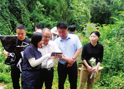 市退役軍人事務(wù)局負(fù)責(zé)人向荊門(mén)市退役軍人事務(wù)局有關(guān)人士了解甘和順烈士墓的保護(hù)情況。通訊員供圖