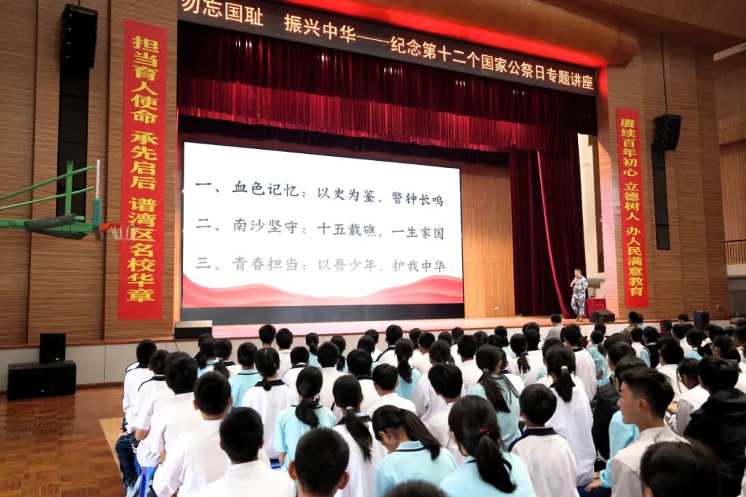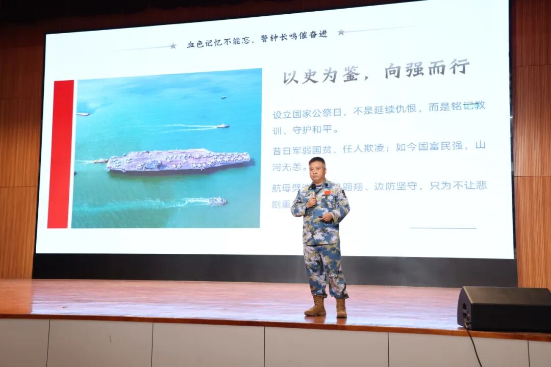 活動邀請中山港口鎮(zhèn)人民武裝部副部長賀洪彪以《銘記歷史守海疆 青春立志報家國》為題開展專題講座,帶領師生重溫南京大屠殺那段山河破碎的屈辱歷史,闡釋國家公祭日的設立意義,讓師生深刻理解“銘記歷史、勿忘國恥”的意義?,F場莊嚴肅穆,全體師生為南京大屠殺死難同胞默哀,用無聲的敬意寄托對逝者的哀思。 會上,賀洪彪結合自身十五載南沙守礁經歷,講述“以礁為家、以苦為榮”的崢嶸歲月,用軍人的忠誠與信仰,詮釋新時代國防衛(wèi)士守護家國的責任擔當,讓師生們真切感受到和平生活的來之不易。
