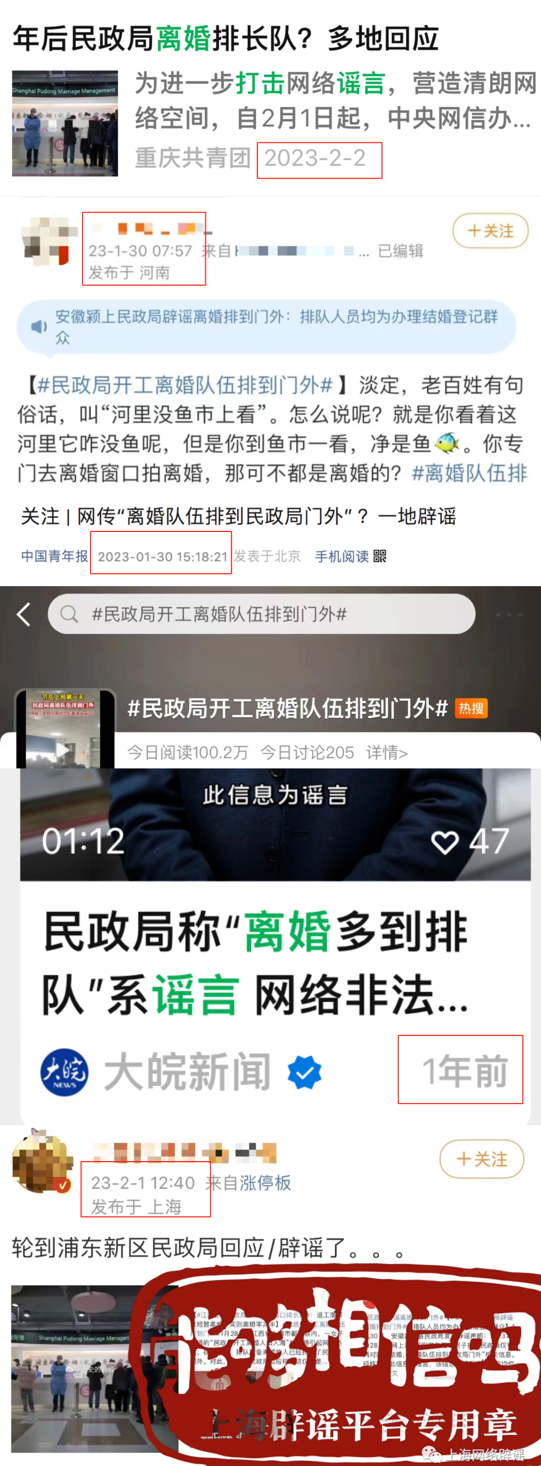 2024年2月18日,王某到安徽省淮南市壽縣政務(wù)服務(wù)中心辦理結(jié)婚登記,在復印材料和拍照的文印室拍攝了一段多人排隊的視頻,配文稱“開年第一天離婚的比結(jié)婚的多”,編造謠言在短視頻平臺發(fā)布,多家媒體報道,引發(fā)網(wǎng)民熱議,造成惡劣社會影響。