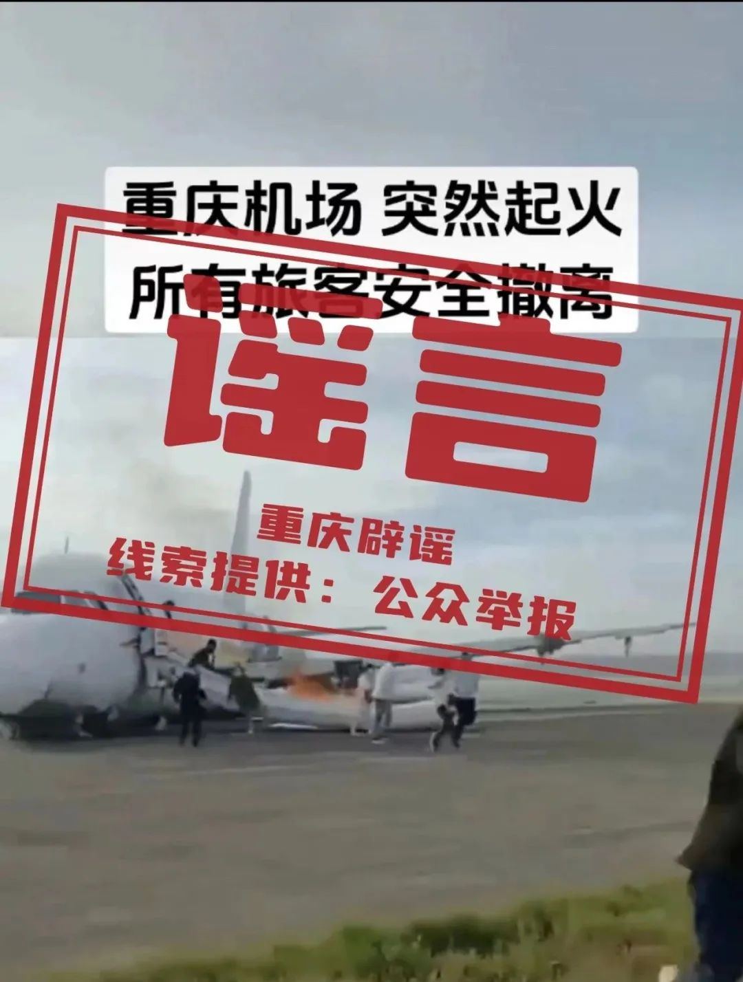 網(wǎng)傳信息為發(fā)布于某網(wǎng)站平臺的一條短視頻,視頻畫面顯示一客機停放在飛機跑道上,不少乘客正從飛機客艙中跑出,并配文稱“重慶機場突然起火,所有旅客安全撤離”。