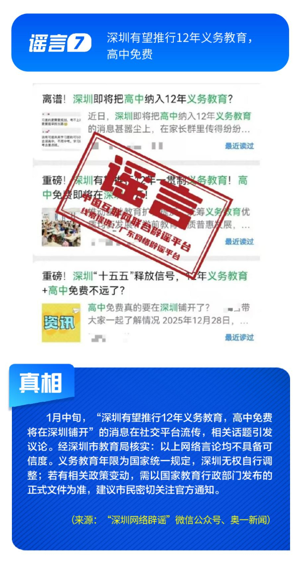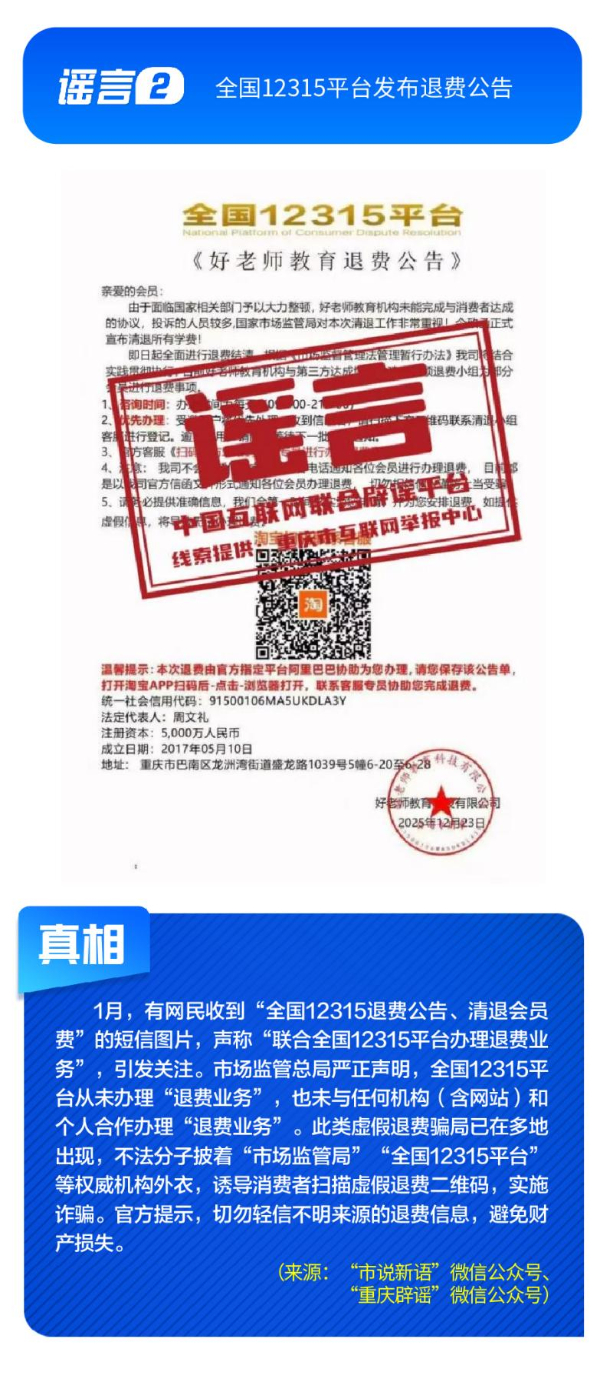 公共政策領(lǐng)域謠言誤導(dǎo)公眾決策?!吧绫?]有有效期限制、未到期不能換新卡”是對(duì)社??ü芾碚叩恼`讀,給民眾平添困擾;“28家博物館元旦期間閉館”實(shí)為少數(shù)博物館根據(jù)運(yùn)營(yíng)安排所做的微調(diào),網(wǎng)帖嚴(yán)重夸大實(shí)際閉館情況,引發(fā)負(fù)面炒作;“深圳有望推行12年義務(wù)教育,高中免費(fèi)”是對(duì)現(xiàn)行政策的“超前編造”,誤導(dǎo)學(xué)生及家長(zhǎng)群體;“全國(guó)12315平臺(tái)發(fā)布退費(fèi)公告”,則是假冒監(jiān)管機(jī)構(gòu)名義散播不實(shí)通知,為后續(xù)詐騙行為做鋪墊。