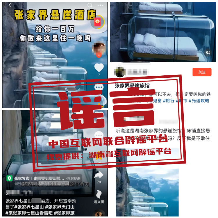 真相:近日,某短視頻平臺(tái)出現(xiàn)多條所謂“張家界懸崖酒店”的視頻,視頻顯示“幾張由玻璃罩著的床,整齊地排列在懸崖上”,文案稱“張家界懸崖旅館房費(fèi)一個(gè)晚上500元”。對(duì)此,經(jīng)媒體記者采訪核查,張家界文旅局及張家界國家森林公園景區(qū)工作人員均表示“不知道懸崖旅館”。同時(shí),記者問詢張家界多家酒店、客棧,均未找到視頻中的“懸崖酒店”。(來源:上游新聞)