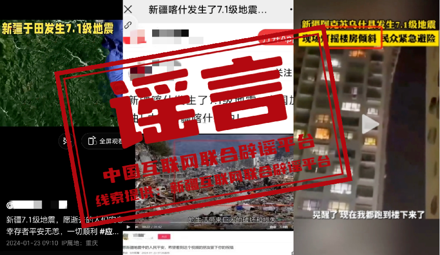 詳情:1月23日2時9分,新疆阿克蘇地區(qū)烏什縣發(fā)生7.1級地震。隨后,關于此次地震的各種不實信息在網(wǎng)絡上傳播,混淆視聽、引發(fā)關注。針對“新疆喀什發(fā)生7.1級地震”“新疆和田地區(qū)于田縣發(fā)生7.1級地震”的網(wǎng)傳信息,經(jīng)喀什市應急管理局和于田縣應急管理局證實,1月23日兩地均未發(fā)生地震,信息為虛假不實內(nèi)容;針對“阿克蘇某小區(qū)樓被地震晃歪了”的圖文信息,經(jīng)相關部門核實,圖片中的建筑物為阿克蘇市鳳凰城小區(qū)居民樓,排查暫未發(fā)現(xiàn)地震造成該樓體傾斜,網(wǎng)傳圖片系建筑物樓體設計和拍攝角度造成的樓體傾斜視覺錯誤;針對上述圖片和視頻顯示的“烏什縣路面損毀嚴重、房屋連片倒塌”相關信息,經(jīng)查是網(wǎng)民利用AI自動生成技術,將烏什縣7.1級地震有關信息與網(wǎng)絡舊圖合成的虛假信息。中國互聯(lián)網(wǎng)聯(lián)合辟謠平臺提醒廣大網(wǎng)民,以官方發(fā)布信息為準,自覺抵制網(wǎng)絡謠言。(來源:“和田網(wǎng)絡舉報辟謠”微信公眾號、“喀什市零距離”微信公眾號、“阿克蘇網(wǎng)絡舉報”微信公眾號)