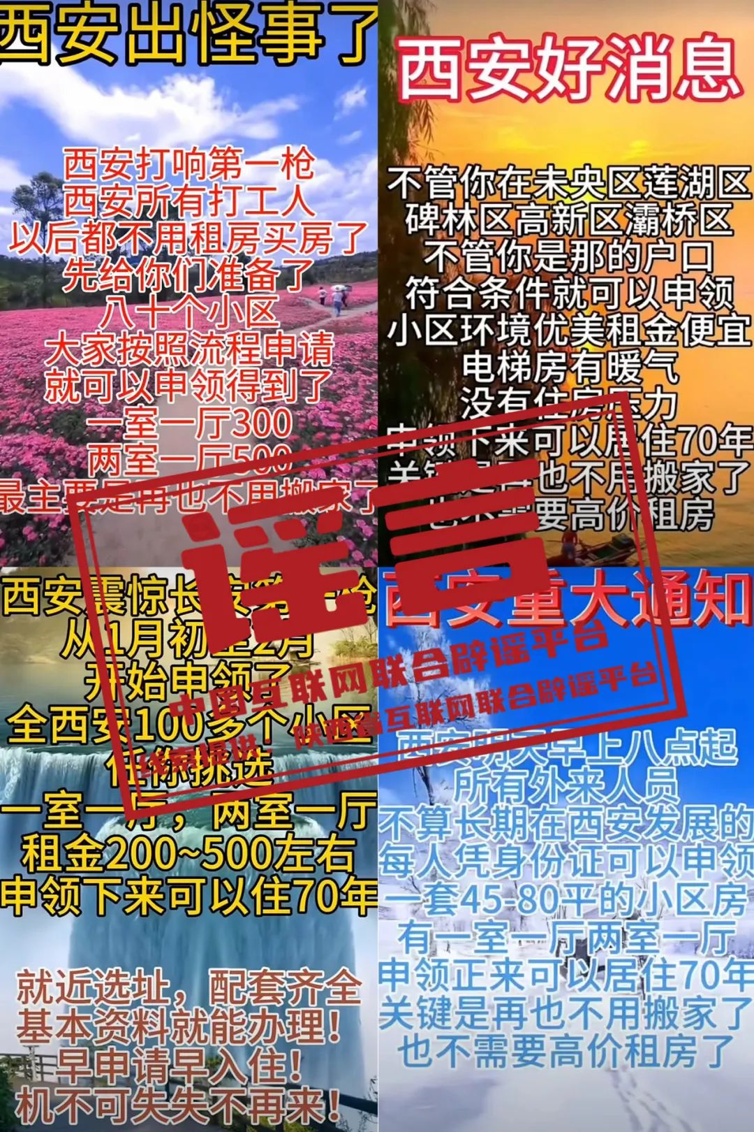 真相:近期,自媒體平臺上出現(xiàn)以“西安緊急通知”“西安出怪事了”等夸大性、煽動性話語為標(biāo)題,散播“憑身份證就可申領(lǐng)”“全西安市100多個小區(qū)任你挑選”“一次申領(lǐng)可以一直居住”等模糊性、誘導(dǎo)性內(nèi)容的信息。對此,西安市保障性住房管理中心發(fā)布聲明回應(yīng)稱,以上內(nèi)容均為不實(shí)信息,是對西安市公租房政策的歪曲理解和斷章取義。該聲明還特別提醒網(wǎng)民:有關(guān)西安市保障房政策、房源等相關(guān)信息,均以西安市住建局官方媒體發(fā)布的信息為準(zhǔn)。(來源:陜西省互聯(lián)網(wǎng)聯(lián)合辟謠平臺、“西安住建”微信公眾號)