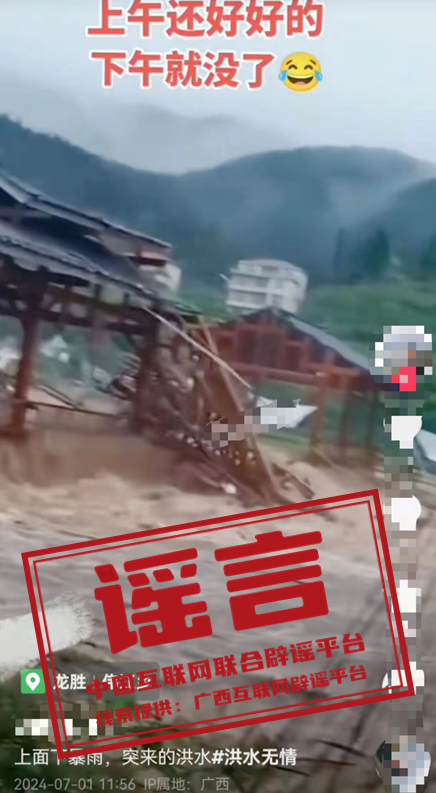 詳情:近日,有網(wǎng)民發(fā)布視頻稱“桂林龍勝一風(fēng)雨橋被洪水沖毀”,并配文“上午還好好的,下午就沒了”,引發(fā)關(guān)注。經(jīng)當(dāng)?shù)毓膊块T核實(shí),偉江鄉(xiāng)轄區(qū)內(nèi)風(fēng)雨橋完好無損,不存在倒塌的情況。該視頻系當(dāng)?shù)鼐W(wǎng)民龍某某罔顧事實(shí)、故意編造,將網(wǎng)上看到的其他地方的風(fēng)雨橋被毀視頻重新編輯并定位在偉江鄉(xiāng)進(jìn)行發(fā)布。目前,警方已依法對龍某某予以行政處罰。(來源:廣西互聯(lián)網(wǎng)辟謠平臺、龍勝公安)