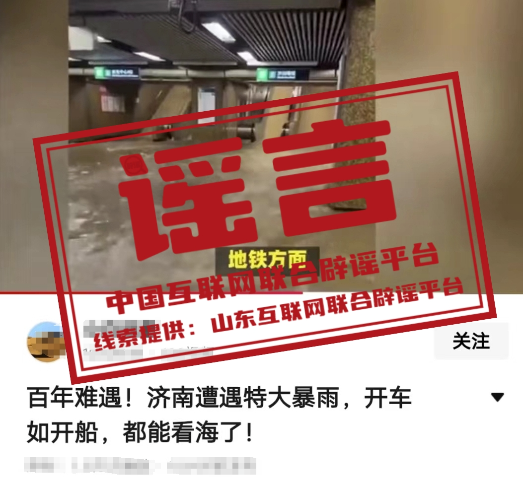 真相:7月22日,一則內(nèi)容為“百年難遇!濟(jì)南遭遇特大暴雨,開車如開船”的視頻信息在網(wǎng)絡(luò)傳播,視頻中還摻雜“車庫(kù)倒灌”“地鐵被淹”等水災(zāi)畫面。經(jīng)當(dāng)?shù)叵嚓P(guān)部門核實(shí),濟(jì)南市氣象臺(tái)于22日11時(shí)解除雷雨大風(fēng)黃色預(yù)警信號(hào),當(dāng)日并未出現(xiàn)特大降雨情況。視頻中的地鐵、街道等場(chǎng)景不在濟(jì)南。該視頻信息為謠言。(來(lái)源:山東互聯(lián)網(wǎng)聯(lián)合辟謠平臺(tái)、濟(jì)南互聯(lián)網(wǎng)聯(lián)合辟謠平臺(tái))