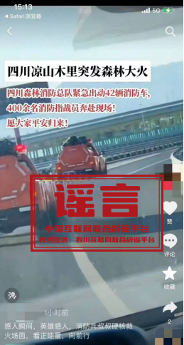 真相:近日,有網(wǎng)民在短視頻平臺上發(fā)布視頻,并配以“四川涼山木里突發(fā)森林大火,四川森林消防總隊緊急出動42輛消防車,400余名消防指戰(zhàn)員奔赴現(xiàn)場”的文字。當(dāng)?shù)鼐W(wǎng)信部門聯(lián)動應(yīng)急管理局進(jìn)行查核,證實四川涼山木里近日未發(fā)生森林大火。(來源:四川互聯(lián)網(wǎng)舉報辟謠平臺)