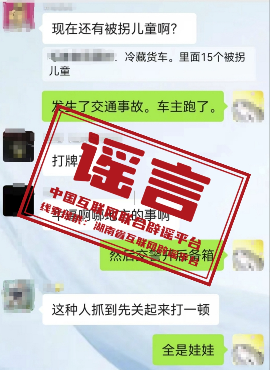 真相:9月4日,一則“湖南一冷藏車發(fā)生交通事故,交警在車上發(fā)現(xiàn)15名被拐兒童”的消息在網(wǎng)絡(luò)社交平臺傳播,引發(fā)網(wǎng)民關(guān)注。5日,湖南省湘潭市公安局雨湖分局發(fā)布警情通報,“經(jīng)公安機(jī)關(guān)查證,該信息系謠言”。目前,虛構(gòu)事實擾亂公共秩序的違法行為人朱某已被公安機(jī)關(guān)依法行政拘留。(來源:“湖南省互聯(lián)網(wǎng)舉報中心”微信公眾號、“雨湖公安”微信公眾號)