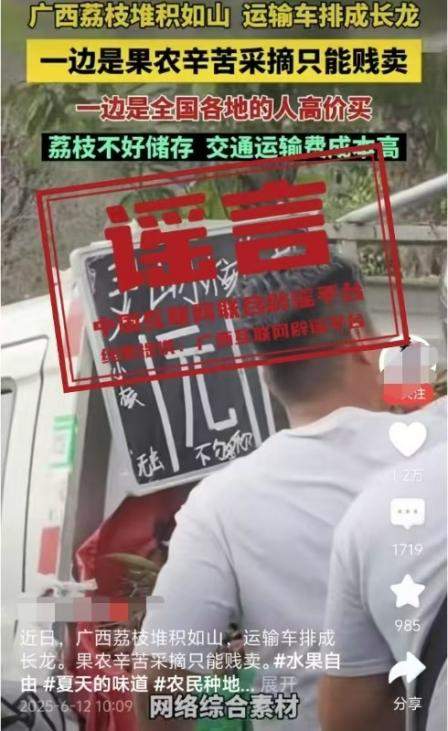 真相:6月12日,網(wǎng)傳“近日廣西荔枝堆積如山,運(yùn)輸車排成長龍。果農(nóng)辛苦采摘只能賤賣”的視頻,畫面顯示荔枝堆積和“靈山荔枝1元”字樣。經(jīng)核查,視頻內(nèi)容并非發(fā)生在靈山縣。目前,靈山荔枝“妃子笑”等中熟品種逐漸批量上市,大規(guī)模上市時間為6月20日左右,當(dāng)前荔枝產(chǎn)銷有序開展,并未發(fā)現(xiàn)個別媒體報道的“荔枝滯銷賤賣”“采摘堆積成山”“運(yùn)輸車排成長龍”的情況,也沒有發(fā)現(xiàn)價格低到1元的荔枝出售。(來源:“廣西互聯(lián)網(wǎng)違法和不良信息舉報”微信公眾號)