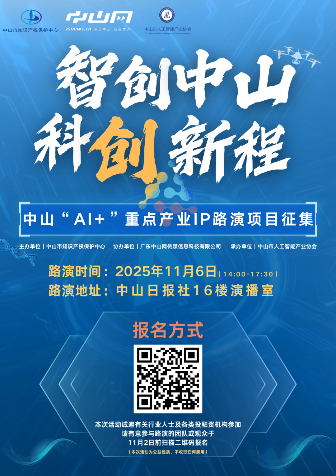 本次活動(dòng)誠(chéng)邀有關(guān)行業(yè)人士及各類(lèi)投融資機(jī)構(gòu)參加,請(qǐng)有意參與路演的團(tuán)隊(duì)或觀眾,于11月2日前掃描以下二維碼報(bào)名。本次活動(dòng)為公益性質(zhì),不收取任何費(fèi)用。