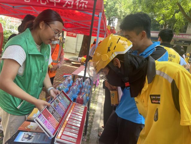 活動伊始,梁主席為活動致辭并給60余名外賣騎手送上夏日清涼飲料及防暑物資,對外賣騎手日常辛苦付出表達(dá)衷心感謝與深情慰問?;顒釉O(shè)置宣傳攤位,外賣騎手與居民群眾駐足攤位前,認(rèn)真聆聽、觀看。禁毒志愿者為大家耐心講解新型毒品的樣式及危害,并結(jié)合騎手配送場景,重點(diǎn)講解“毒駕”危害及可疑包裹識別技巧,強(qiáng)化職業(yè)群體防毒意識,同時警示騎手嚴(yán)守驗(yàn)視制度,若發(fā)現(xiàn)異常訂單,請立即通過“一鍵報(bào)警”功能舉報(bào),防止涉毒食品或物資流入消費(fèi)者手中,共同筑牢外賣配送禁毒防線。