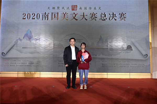 中共中山市委常委、宣傳部長(zhǎng)林銳熙為冠軍作者徐樂(lè)瑤頒獎(jiǎng)。